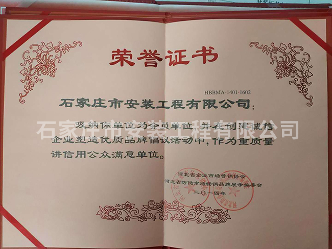 重質(zhì)量講信用公眾滿意單位榮譽(yù)證書(shū)
